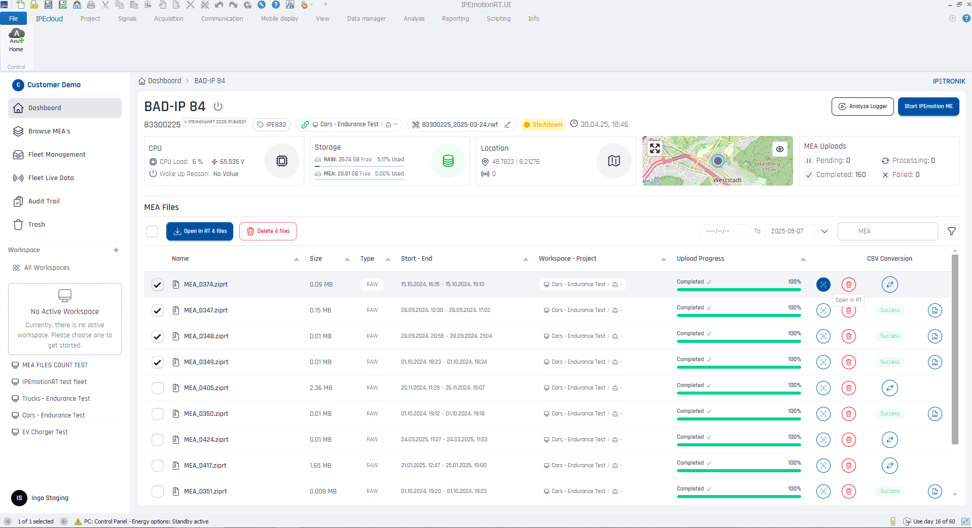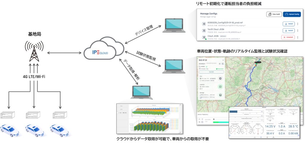 IPEcloud2 は、車両データの管理と解析を効率化するクラウドベースのSaaSプラットフォームです。リアルタイムでのデータ処理に加え、世界中どこからでもデータの整理・可視化・共有が可能です。スケーラブルな設計により、多数の試験車両や長期運用にも柔軟に対応します。フリート管理や試験データの効率的な運用を目指すエンジニアの方々にご活用いただけます。